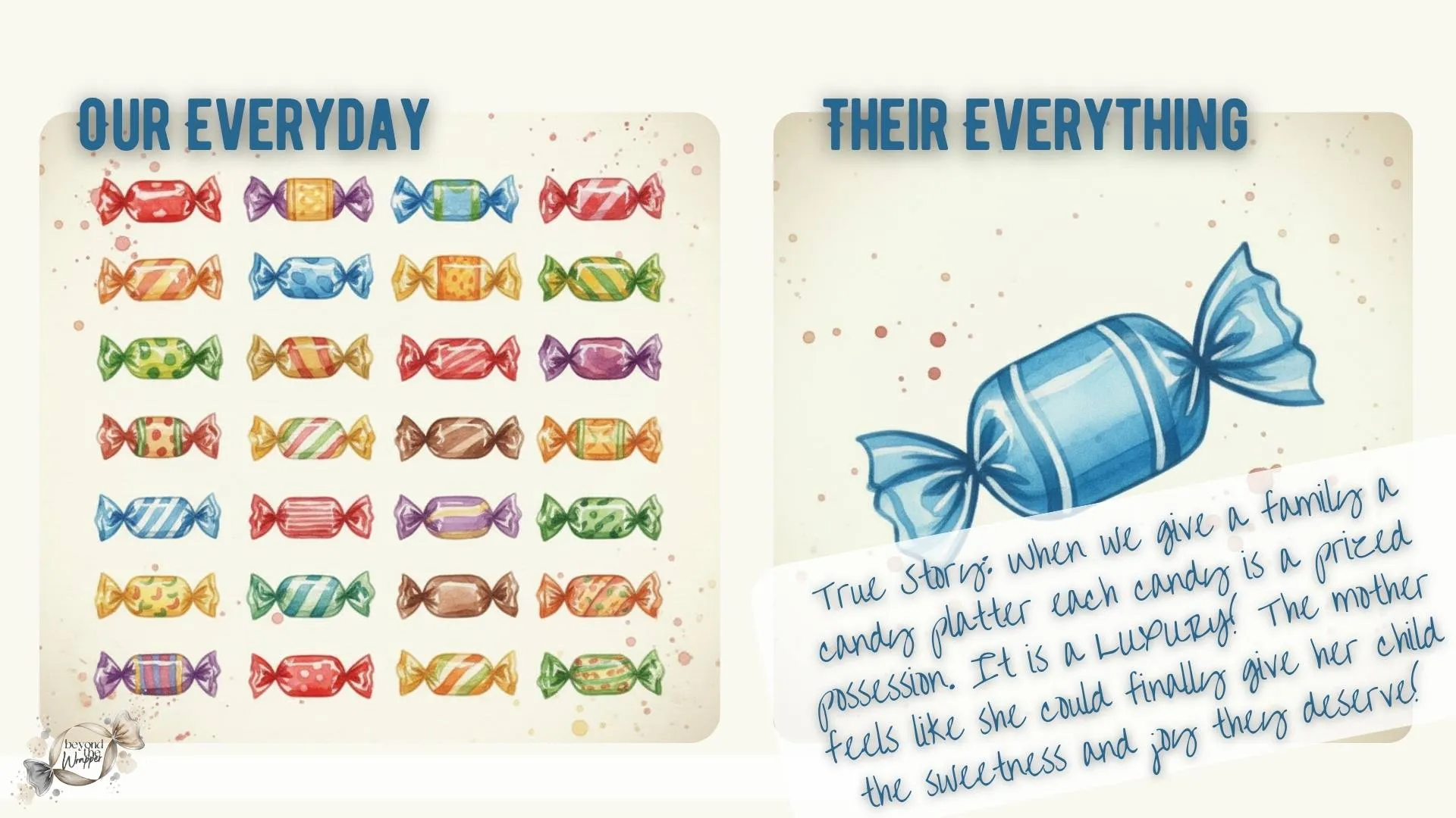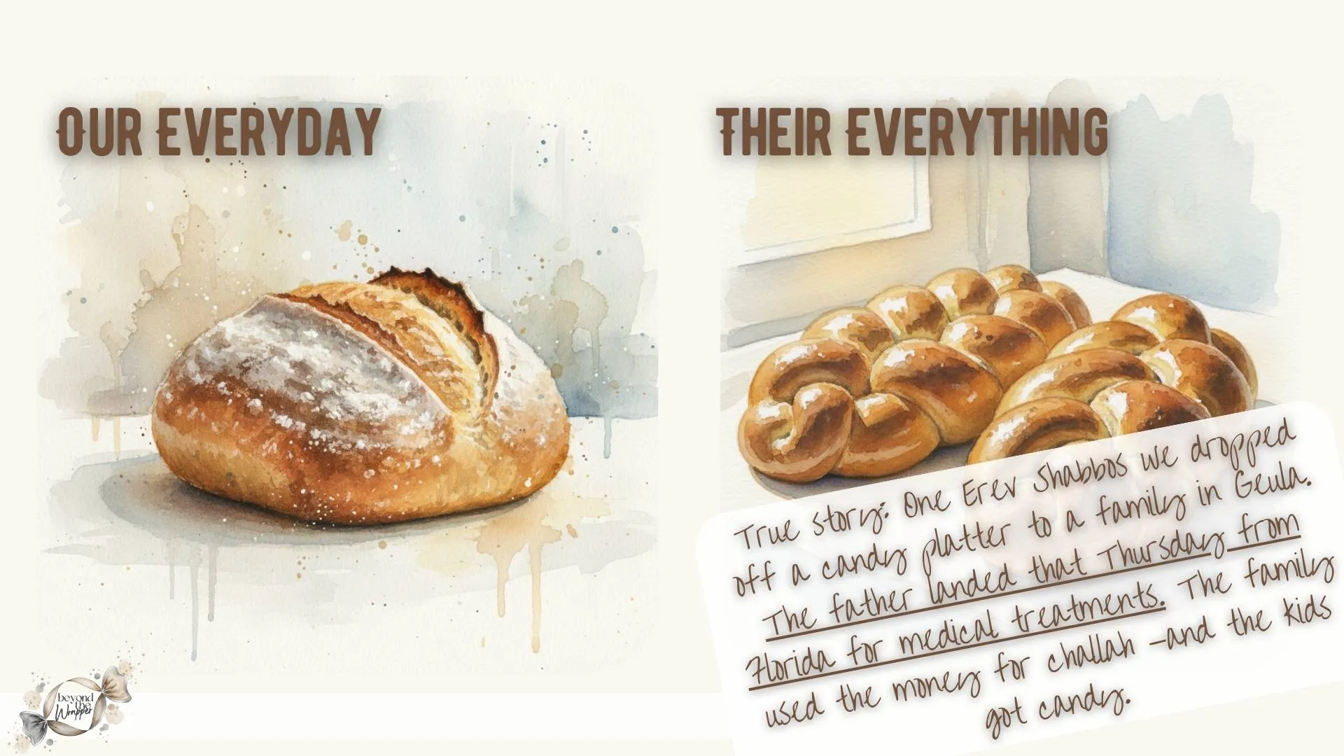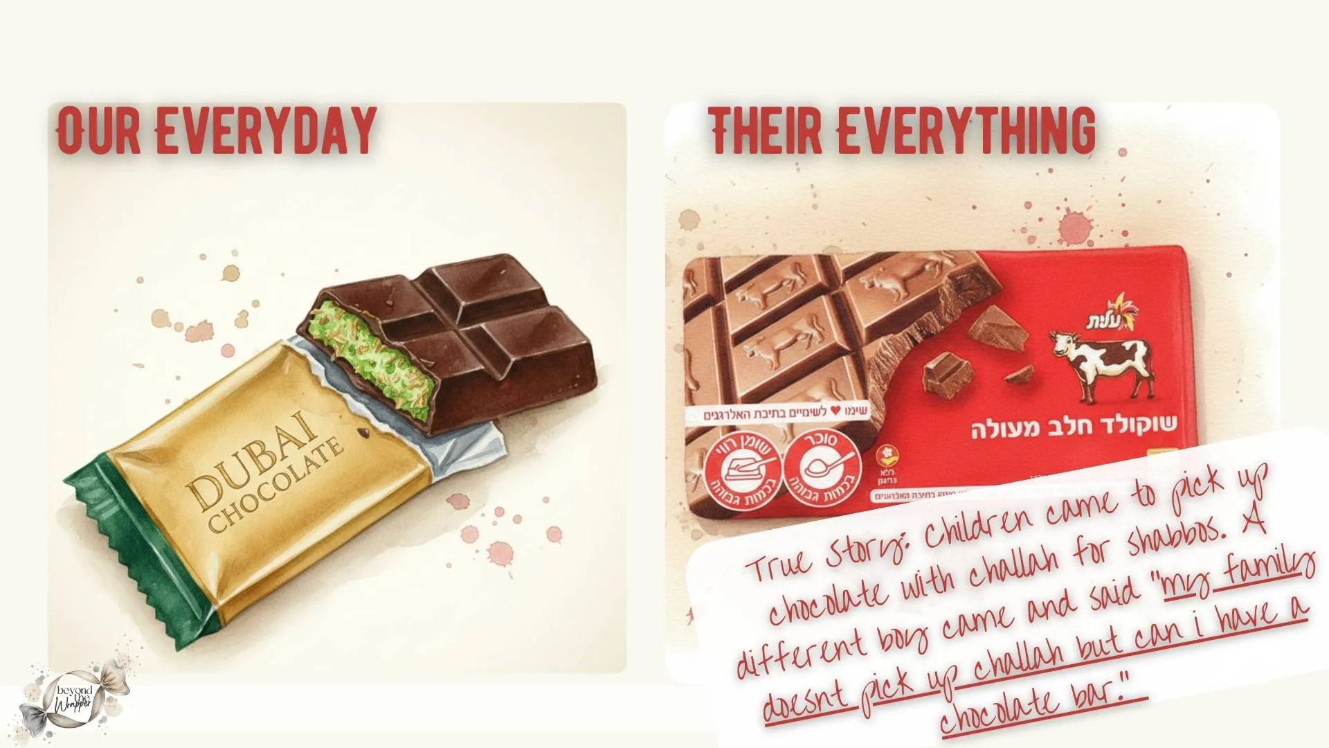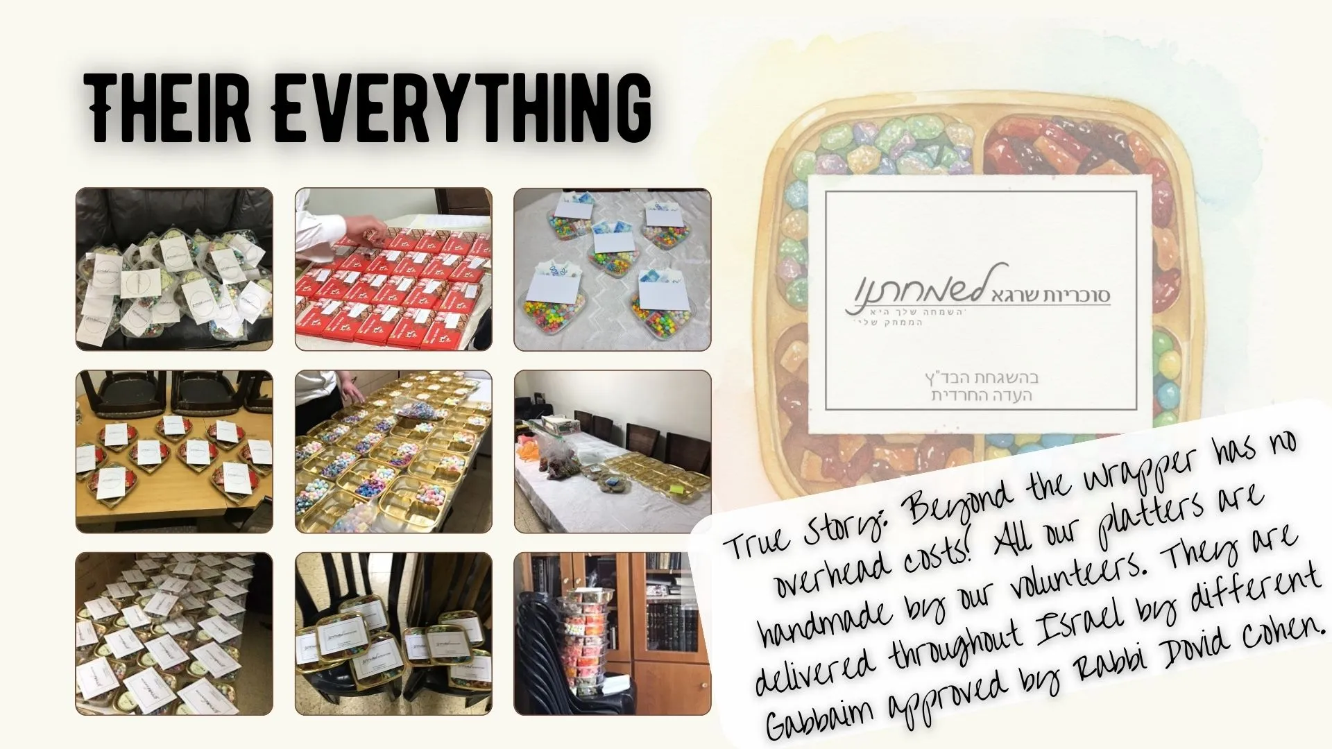 $30.00Beyond the Wrapper delivers $130 with a candy platter to needy families throughout Eretz Yisroel. Families have told us this is the sweetest way they have ever received charity. Beyond the Wrapper’s goal is to bring a little joy into the darkness of poverty. The joy on a mother’s face when she receives money with a candy platter tells a story. A story of a mother who wants to give her family basic necessities. Now she can give them necessities with candy! You can give her that ability. Your support enables us to give these families moments of happiness. Moments that restore strength and help them carry on through difficult times. Beyond the Wrapper also distributes chocolate bars when families come to pick up challah for Shabbos. This Purim Beyond the Wrapper will also distribute soda bottles. The children love receiving this and reuse the bottles. It gives them a sense of ownership and a sweet feel to Purim. All candy platters are made in Israel and are distributed through Gabbai tzedakah approved by Rabbi Dovid Cohen and Rabbi Chaim Goldberg zt”l across EY.