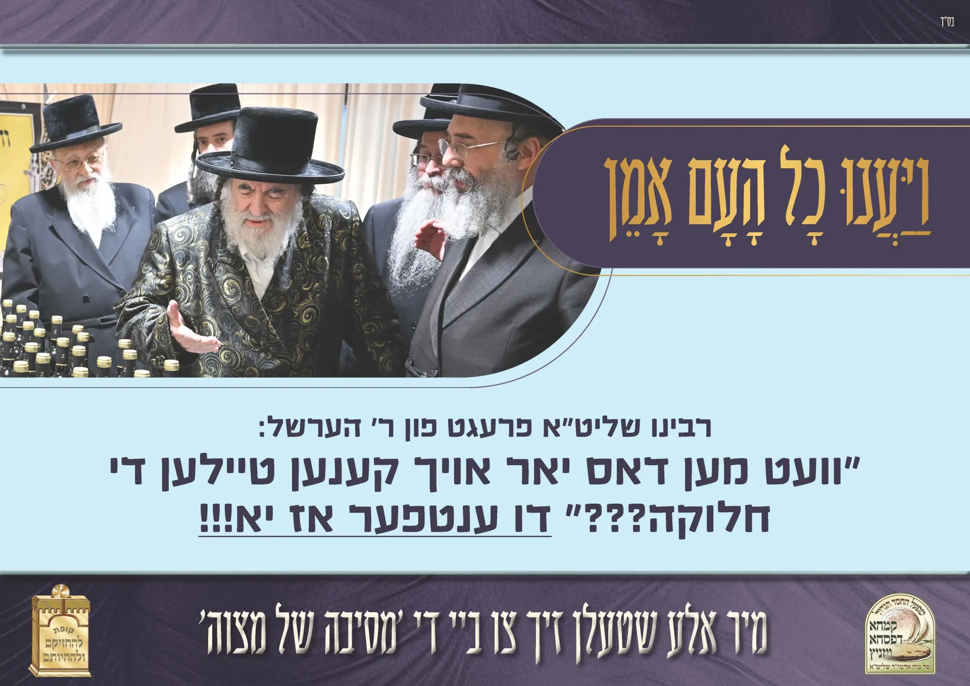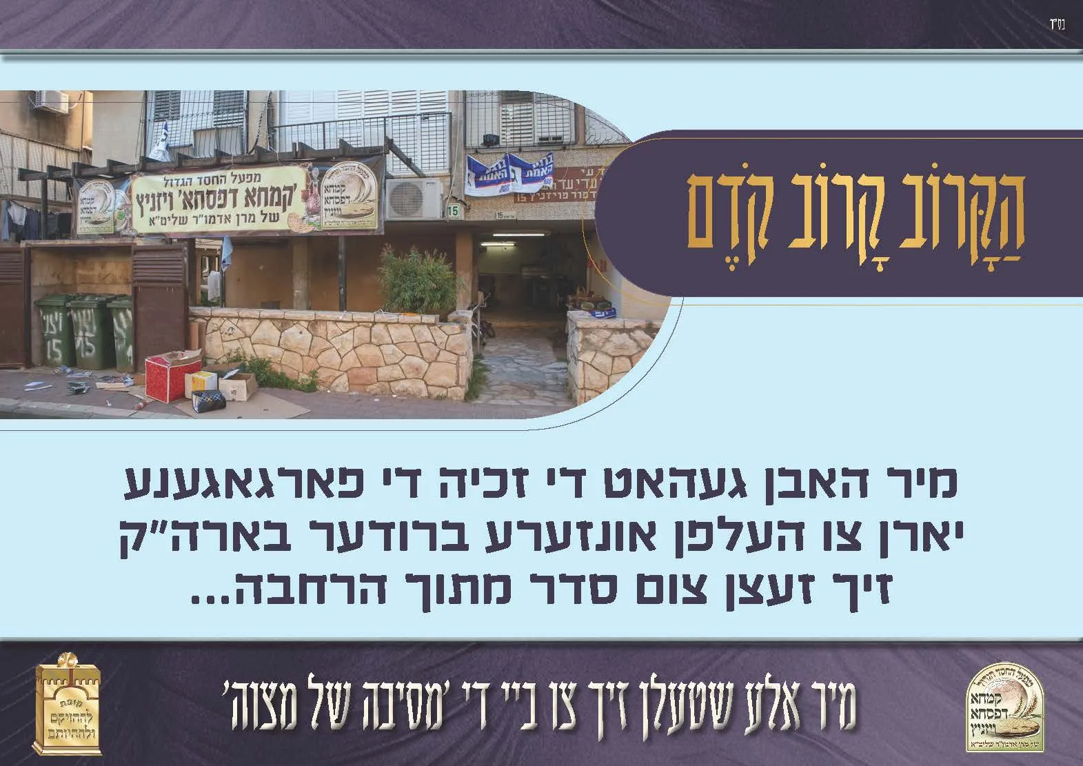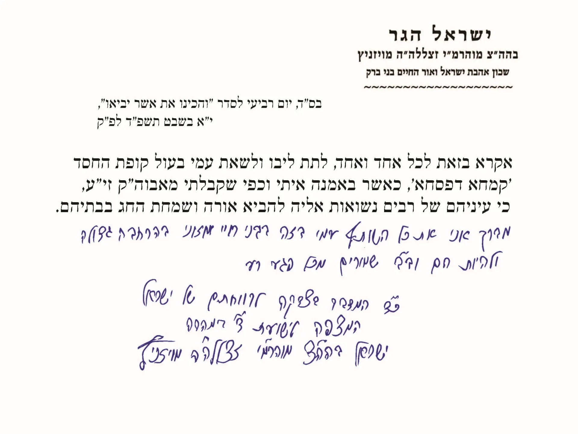איך ווענד זיך צו אייך היינט מיט א בקשה צו נעמען א חלק אין דעם ויזניצע רבין’ס הייליגע ארבעט. יעדעס יאר זעען מיר די אומדערמידלעכע מסירות נפש פון די רבין פאר דעם צוועק; זיין הארץ איז שטענדיג אפן פאר יעדן נצרך, און ער אליין לייגט אריין כוחות עצומות צו פארזיכערן אז יעדע אידישע שטוב זאל האבן מצה, וויין, און א שיינעם יום-טוב טיש מיט הרחבה.