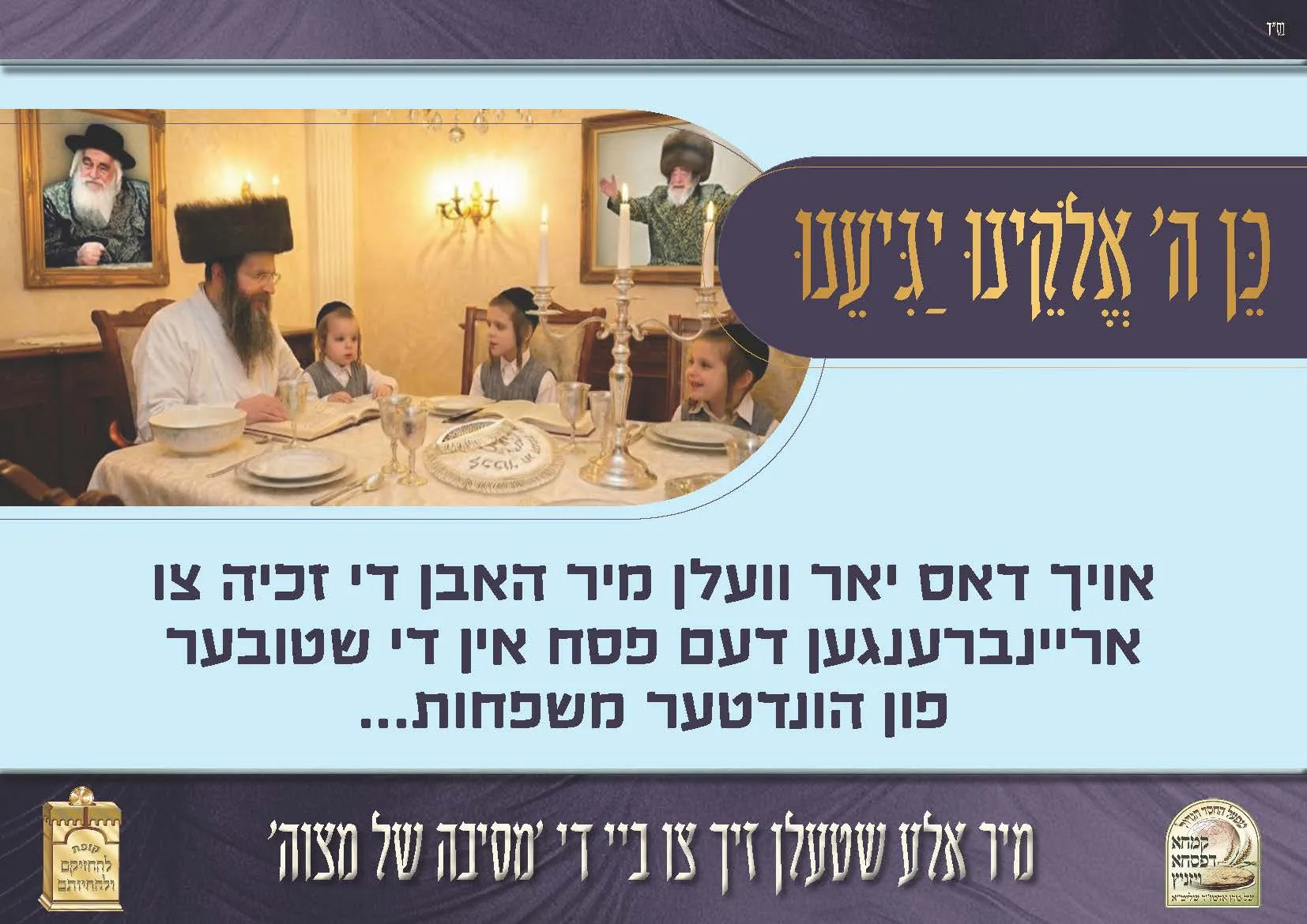 בזכות מצוה רבה זו, זאלט איר און אייערע משפחות געבענטשט ווערן מיט א געזונטן, פרייליכן און כשר’ן פסח.