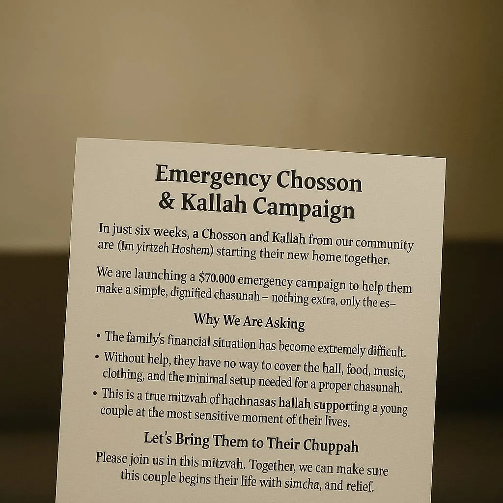 We are launching a $$35000.00campaign to help them make a dignified chasunah — only what’s needed, nothing extra.