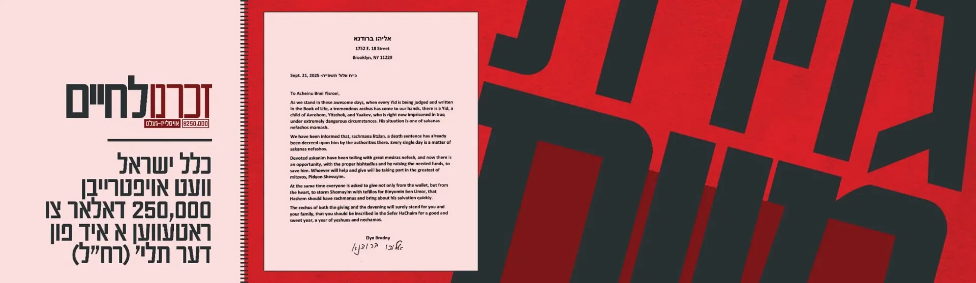 Time is running out for a young Jewish man facing execution. Us Yidden must unite NOW to save a life. The "Zachreinu L'Chaim" campaign has launched what may be our final opportunity to rescue Binyamin Chasin, a 30-year-old Yid sitting on death row in an Iraqi prison. With just $250,000 standing between life and death, this is our moment to show what it means to be responsible for one another.