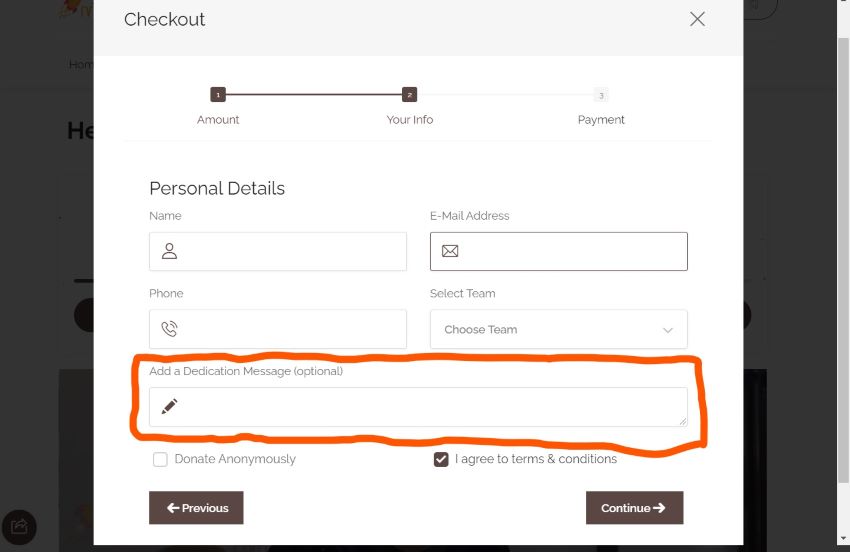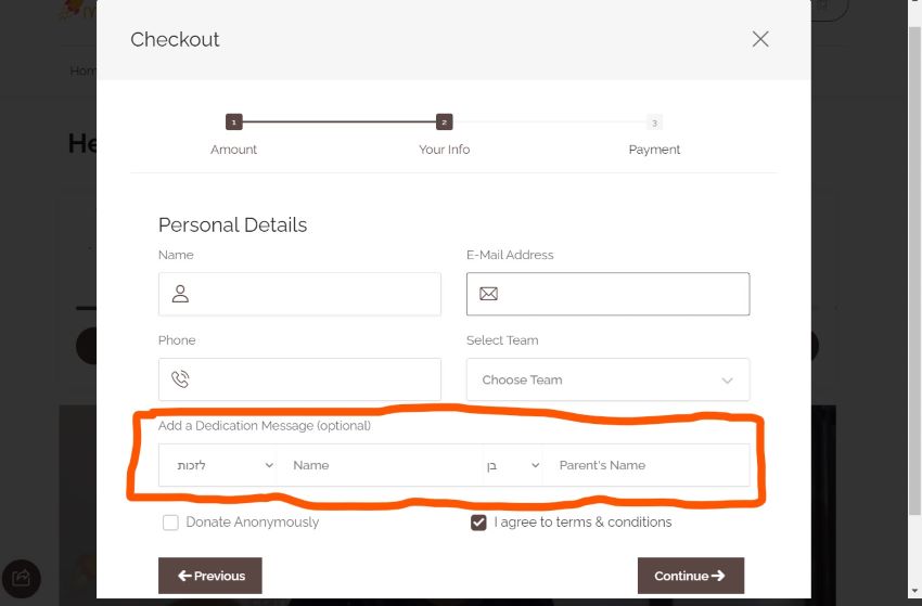 You can choose from 2 types of dedication messages. 1: The usual input where a donor can enter the message, or 2: A remembrance message where a donor can enter a name to learn or daven for. Below are screenshots of how these look on the checkout form
