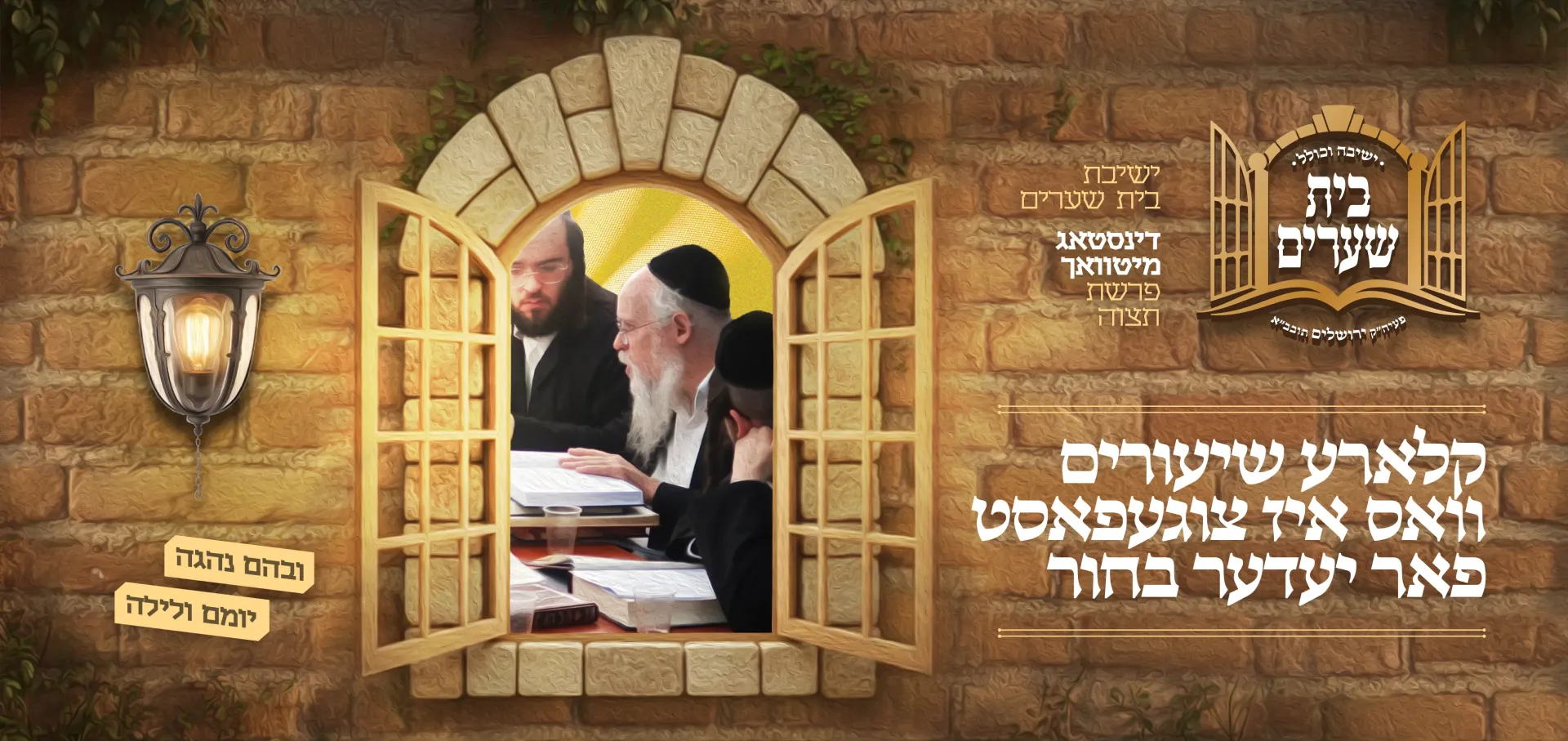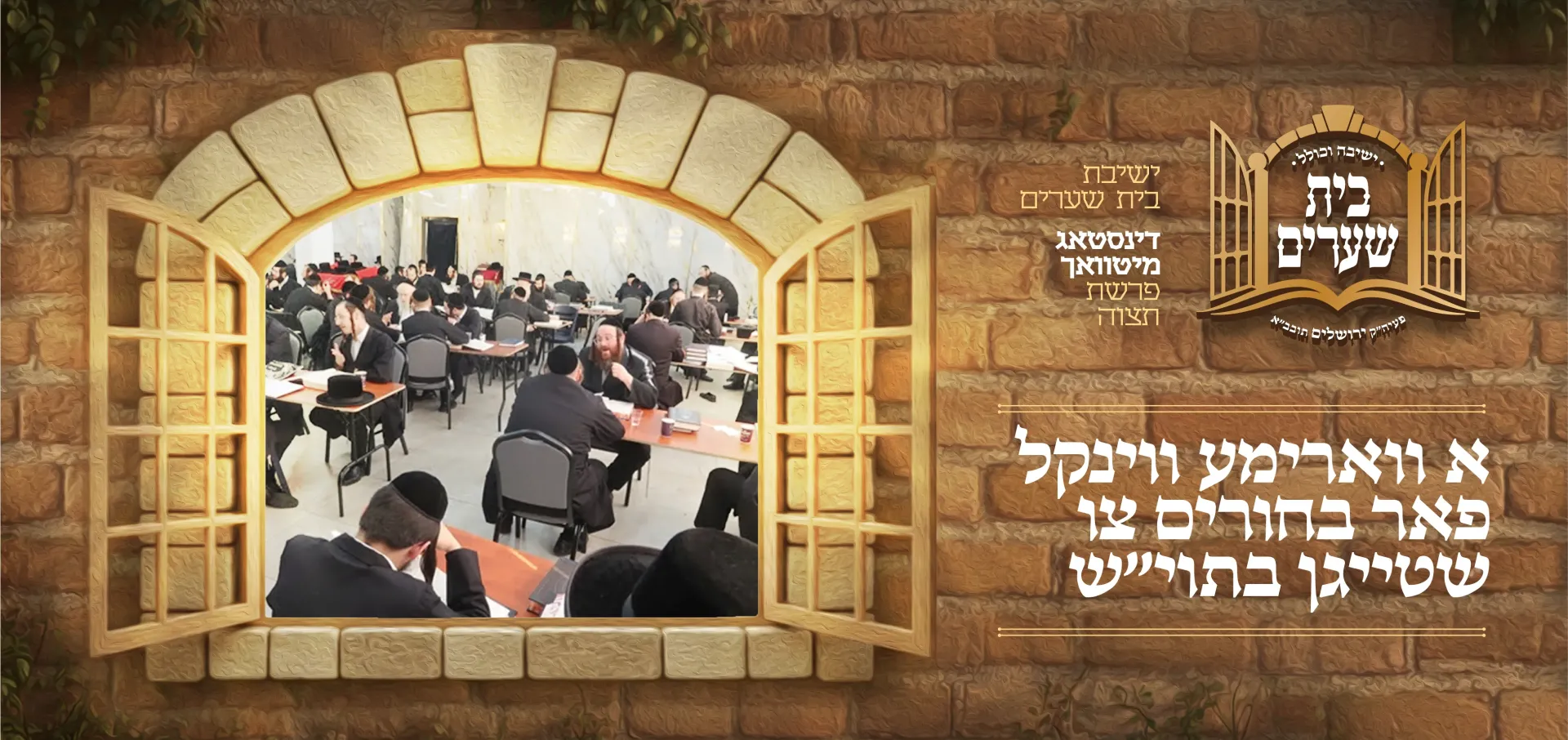 צווישן די געסלעך פון ירושלים עיר הקודש, ארומגענומען מיט די הרי ציון, שיינט ארויס אן אור גדול פון א הייליגער מקום תורה, די באשיידענע אבער גלאררייכע ישיבה "בית שערים", וואו עס זיצן צענדליגער ערוואקסענע חסיד׳ישע בחורים וועלכע זענען געקומען צו פארן פון חוץ לארץ פארענדיגן זייערע ישיבה יארן, און דא פארמאגן זיי נישט קיין שום דאגה אויף דער וועלט, חוץ פון פארענטפערן א שווערן תוספות און רבי עקיבא אייגער.